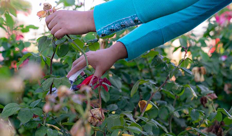 Sanchez says she has learned from technical gardener John Villarreal that by pruning, she stimulates new growth, keeps the rose bushes neat, and emphasizes the beauty of newly bloomed rose heads. Photo by Aric Allen.