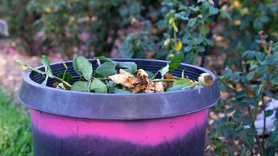 Pruned rose stems and leaves fill a container in the Rose Garden. Photo by Aric Allen.
