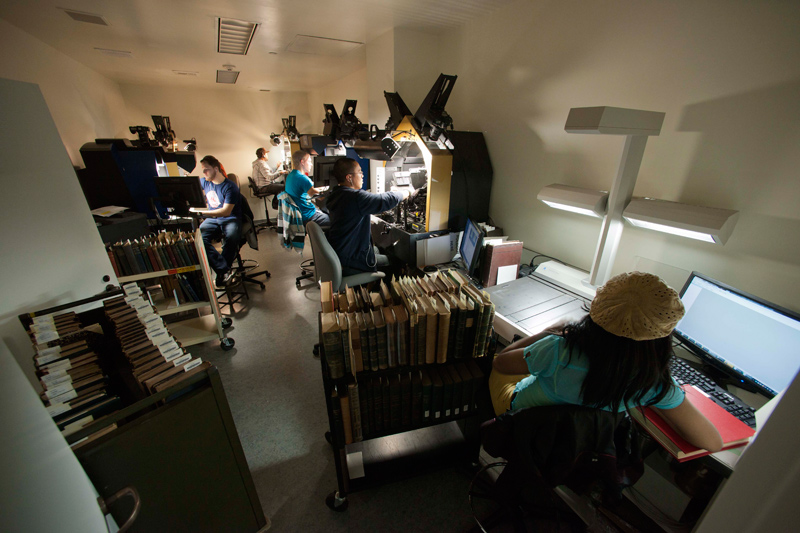 Technicians from Gale Cengage onsite at The Huntington. They are completing the scanning of 5,000 books from The Huntington's collection on the history of science. Photo by John Sullivan, The Huntington Library, Art Collections, and Botanical Gardens.