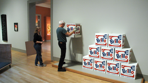 Susan Colletta, Art Collections registrar, and Gregg Bayne, exhibits manager install Brillo Boxes (1964-1990)