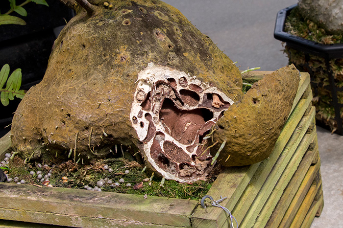 When viewing the surprising chambers inside ant plants, people new to them often ask: “Where are the ants?” The Huntington’s ant plants house no ants; fortunately, these plants form their tuberous bases—handy for water storage as well as ant homes—whether they interact with ants or not. In fact, even the tiny seedlings of ant plants exhibit a caudex and form entrance holes and chambers as they grow, regardless of whether ants are present. So the more intriguing question may be this: can the ants survive without the plants?