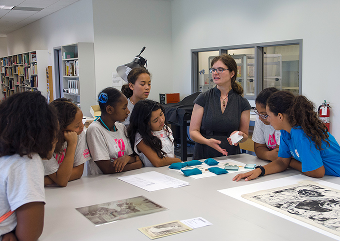 In the conservation lab, paper conservator Jessamy Gloor discussed some of the tools and techniques she uses while showing the YWCA campers some of the rare documents currently receiving treatment. Photo by Lisa Blackburn. The Huntington Library, Art Collections, and Botanical Gardens.