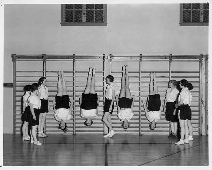 Girls turned head-over-heels for fitness in this photograph promoting the YWCA’s Business Girls’ Club gym class, ca. 1930s. Pasadena YWCA Collection. The Huntington Library, Art Collections, and Botanical Gardens.