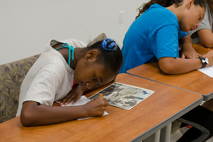 Inspired by their four-week experience with Huntington curators and collections, the YWCA campers got a chance to act as curators themselves, writing sample label text for a selection of historical photos of earlier YWCA programs. Photo by Lisa Blackburn. The Huntington Library, Art Collections, and Botanical Gardens.
