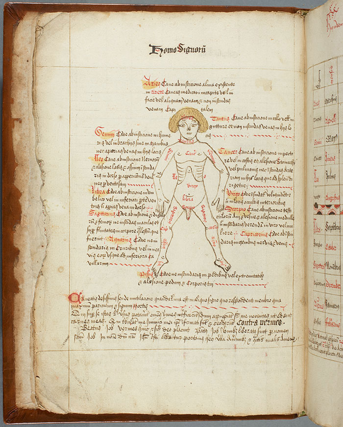 Different parts of the manuscript’s “zodiac man” (found on folio 12 verso) are labeled with the signs of the zodiac to which that part corresponds: Taurus for the neck, for example, and Virgo for the belly. This information was important in making decisions about medical treatment. The Huntington Library, Art Collections, and Botanical Gardens.