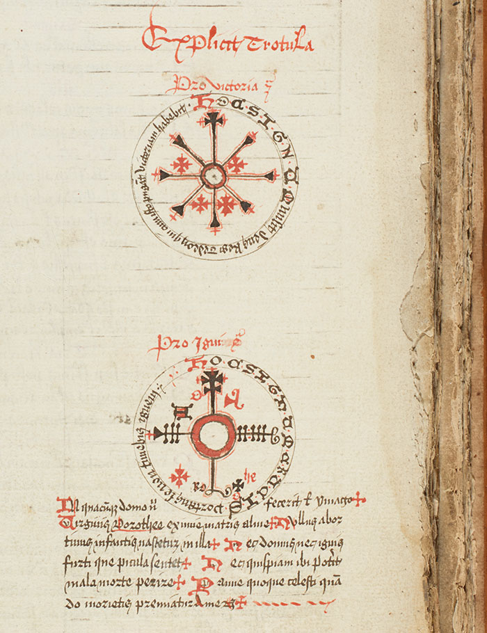Among the medical practices found in this medieval manuscript are such charms as the ones found on this page (folio 34 recto). These specific charms state that the person who wears or carries them will have victory in battle (the top one) and will not be afraid of fire (the bottom one). The Huntington Library, Art Collections, and Botanical Gardens.Today many of the medical practices that we find in medieval texts would fall into the category of occult beliefs, and we might even call the charms and incantations “magic.” On the other hand, this textual collection, and other manuscripts like it, also demonstrate the vast amount of knowledge and care that went into these practices. Although we might not believe in their efficacy today, these methods required a high degree of expertise in a number of heterogeneous fields of scientific inquiry. Some of these fields—botany, especially—have continued to be essential to modern medical innovation. In planetary sciences, the detailed collection of observational data for astrological tables, like the ones in this manuscript, would soon be taken up by such early modern scientists as Brahe, Copernicus, and Kepler to revolutionize our understanding of our place among the stars. And indeed, sometimes even medieval prescriptions can still surprise us. Recently, researchers looking for novel approaches to treat antibiotic-resistant bacterial infections found that a medieval recipe for wound salve was surprisingly effective.