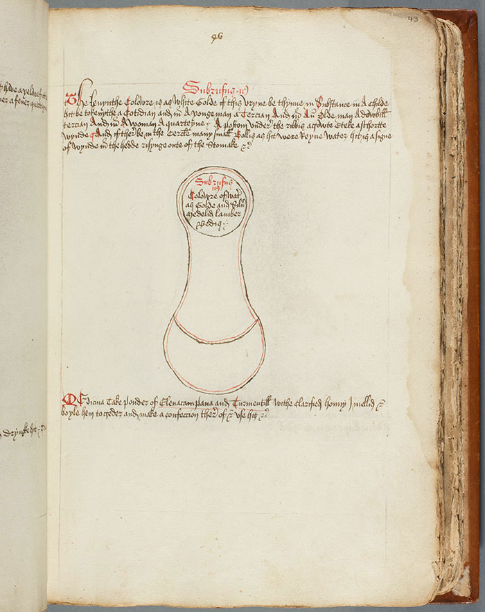 On this page (folio 43 recto) is an illustration of a urine bottle. Medieval doctors would recognize and assess small variations in color and quality in urine samples—a noninvasive diagnostic method which, in a different version, is still in use today. However, in this particular manuscript, the bottles were never colored in to depict the urine samples. The Huntington Library, Art Collections, and Botanical Gardens.