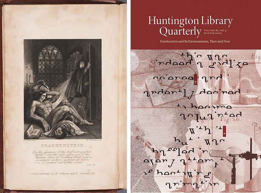 Left: Frontispiece from the third edition of Mary Wollstonecraft Shelley’s gothic novel Frankenstein: or, the Modern Prometheus, 1831. The Huntington Library, Art Museum, and Botanical Gardens. The engraving on the frontispiece, produced by William Chevalier from a drawing by the British artist Theodor von Holst (1810–1844), is the first known visualization of Victor Frankenstein and his creature attached to an edition of the novel itself. Right: Cover of the HLQ special issue, “Frankenstein and Its Environments, Then and Now.”