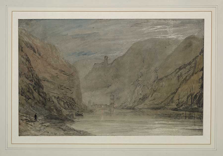 Joseph Mallord William Turner, Saint Goarhausen and Katz Castle by Moonlight, 1817, watercolor with scraping out on wover paper, 7 1/2 x 12 1/8 in. (19.1 x 30.8 cm.). The Huntington Library, Art Museum, and Botanical Gardens.