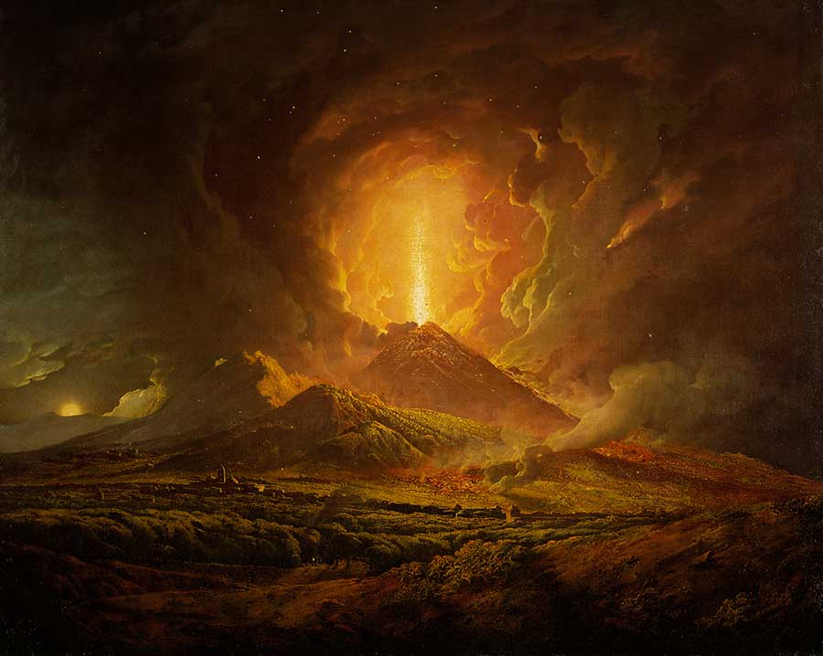 Joseph Wright of Derby, Vesuvius from Portici, ca. 1774–76, oil on canvas, 39 3/4 x 50 in. (101 x 127 cm.). Purchased with funds from the Frances Crandall Dyke Bequest. The Huntington Library, Art Museum, and Botanical Gardens. The explosion of Mount Tambora, of which there are no known contemporary depictions, is thought to be the largest volcanic eruption in human history, killing upward of 70,000 people. The eruption of Vesuvius in the year 79, which destroyed Herculaneum and Pompeii, was approximately one-hundredth its size. This painting seems to be of an imaginary eruption, as Vesuvius was not active when Joseph Wright visited Italy; Vesuvius did, however, experience major eruptions throughout the 18th century.