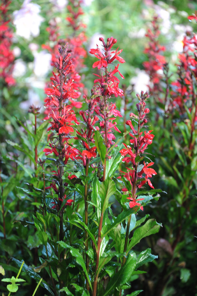 More widespread and well-known is a lobelia that produces glowing spikes of cardinal-red flowers in mid- to late summer. A plant of wet areas, Lobelia cardinalis will sometimes make an arresting play in small clearings amid the somber black greenness of a swampy forest. Because I first encountered this lobelia in Alabama swamps, I think of it as a purely Southeastern plant. But L. cardinalis ranges well down into Mexico, where it is sometimes called L. splendens, and populations have even been reported from much further afield.