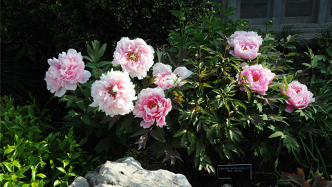 In the event they never bloom so beautifully again, it is worth posting a photo of a very nice clump of herbaceous peonies that exploded in bloom this week in Liu Fang Yuan. And perhaps with a few words of encouragement, any readers who plan to visit the Gardens in the next day or so should make a journey to the Plantain Court (the main courtyard) in the Chinese garden for the simple pleasure of viewing this minor spectacle.