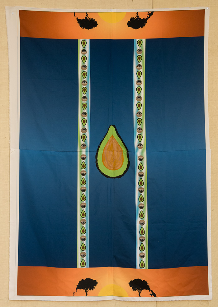 Alfredo Alvarado recalled picking avocados with his grandmother and used the fruit as a motif in his textile pieces Avocado Pattern and Avocado Guayabera. Giant ground sloths also appear. Alvarado explains: “The giant ground sloth would eat the avocado whole and once the seed would pass, the seed would grow into a new tree.”