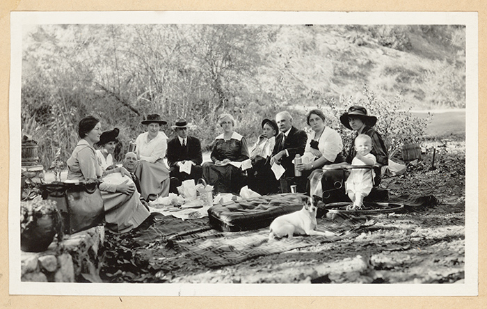 Ralph Arnold shot this 1918 photo of his wife, Winninette Arnold, (sixth from left), in Pasadena, Calif., with friends and family, including Winninette’s mother, Ora Stokes (fourth from left), brother, Frank Stokes Jr. (fifth from left), father, Frank Stokes (fourth from right, with moustache), and sister, also named Ora Stokes (third from right, next to father, Frank Stokes). The Huntington Library, Art Collections, and Botanical Gardens.