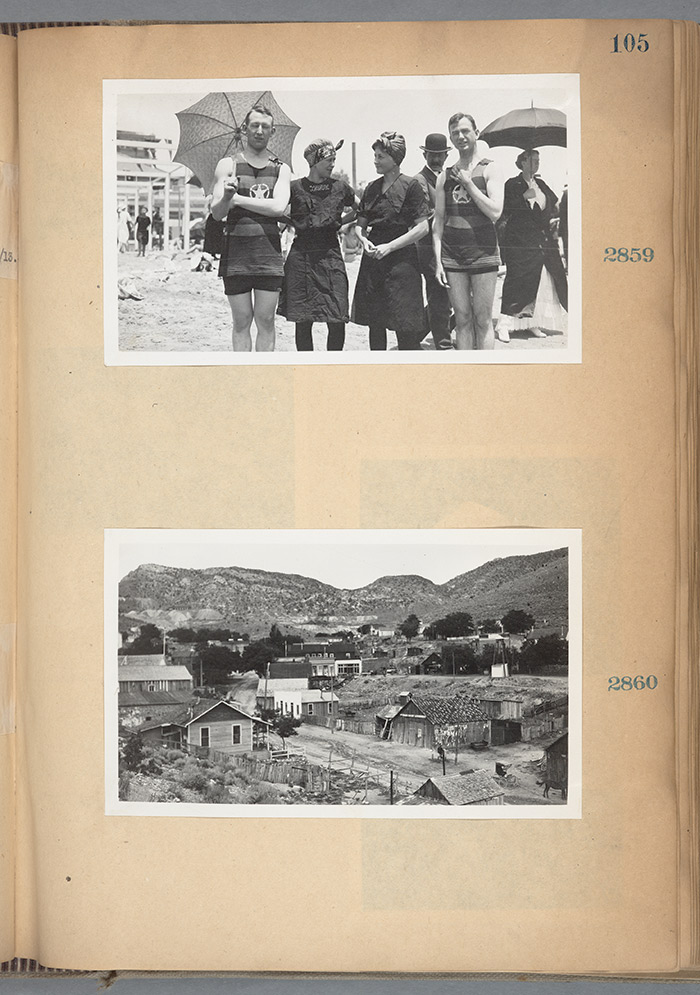 Ralph Arnold pairs two seemingly incongruous shots from 1913 on this page of a photo album. Above is an informal shot that Winninette Arnold took of her husband (on right) standing next to her mother, Ora Stokes, and an unidentified couple in Long Beach, Calif. The photo below, taken by Ralph Arnold, shows a mining town near Pioche, Nevada. The Huntington Library, Art Collections, and Botanical Gardens.
