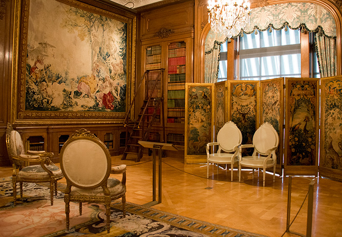 In the Large Drawing Room, the Huntingtons' taste for elegant sophistication is evident in the finely hand-carved wall panels and intricate French furnishings. Visitors are invited to touch a reproduction of a gilded metal mount attached to an 18th-century chest of drawers by German cabinet-maker Martin Carlin and imagine how it would catch the candlelight.