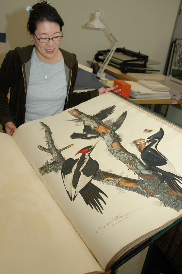 Exhibition preparator Lauren Tawa with the Ivory-Billed Woodpecker, plate no. 66, from Audubon’s Birds of America. Huntington Library, Art Collections, and Botanical Gardens.