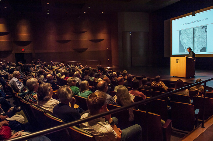 Peter J. Blodgett, The Huntington’s H. Russell Smith Foundation Curator of Western American Manuscripts and editor of Motoring West, lecturing on Aug. 8 in The Huntington’s Rothenberg Hall. Photo by Martha Benedict.