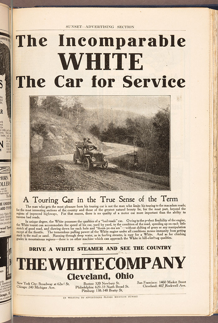 This 1908 advertisement in Sunset assured the reader that the White steamer could surmount any obstacle on the road, ranging far beyond the realm of “improved highways.” A “true” touring car, the manufacturer asserted, could take the traveler to precincts of the “greatest natural beauty,” even if it had to cross the most intractable terrain. The Huntington Library, Art Collections, and Botanical Gardens.