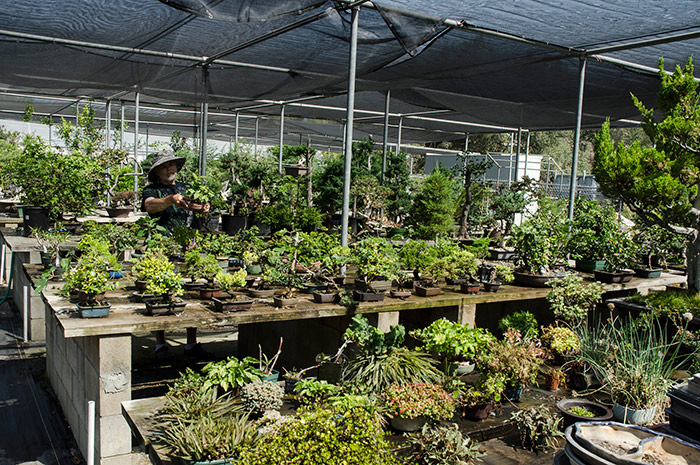 The quality of the bonsai collections at The Huntington appeals to prospective donors, who know their trees will be well cared for. In the nursery area, Matson checks on a group of donated shohin bonsai (trees less than 8 inches tall). Photo by Lisa Blackburn.