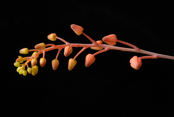 The tiny Madagascar native Aloe descoingsii is a repeat bloomer—flowering nearly year-round—whose slender stalks bear urn-shaped, scarlet-orange flowers with yellow tips. Photo by Karen Zimmerman.