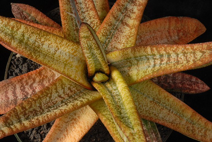 The variegated yellow and red-blushed leaves of this Gasteria batesiana from South Africa set it apart from the typical form of the species with green leaves. Photo by Karen Zimmerman.
