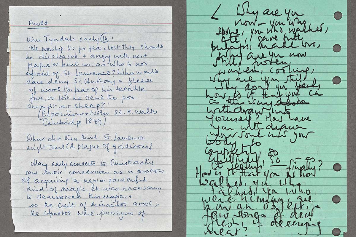 Left: Hilary Mantel’s notes on William Tyndale’s view of saints for her novel Fludd (1989). The Huntington Library, Art Museum, and Botanical Gardens. Right: Anatomist John Hunter addresses the dead in an early draft of Hilary Mantel’s novel The Giant O’Brien (1998). The Huntington Library, Art Museum, and Botanical Gardens.