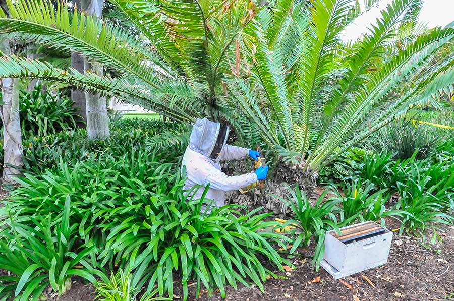 One early morning, while The Huntington was closed to visitors, beekeeper Kevin Heydman extracted a hive of bees from a cycad near the Huntington Art Gallery. Photo by Andrew Mitchell.