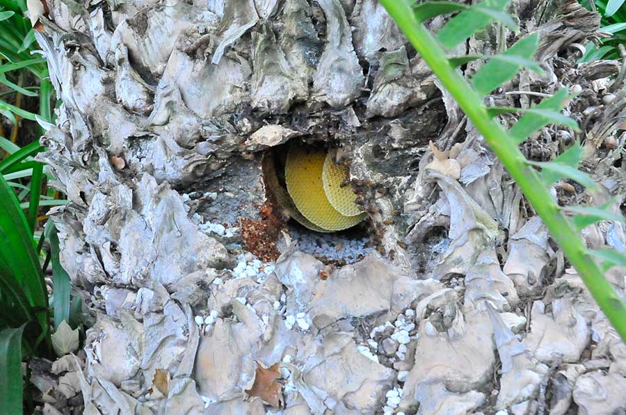 The hive’s honeycomb is visible through a hole in the cycad’s trunk. Photo by Andrew Mitchell.