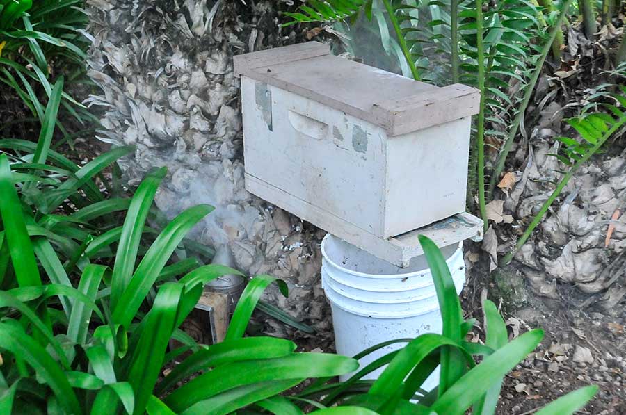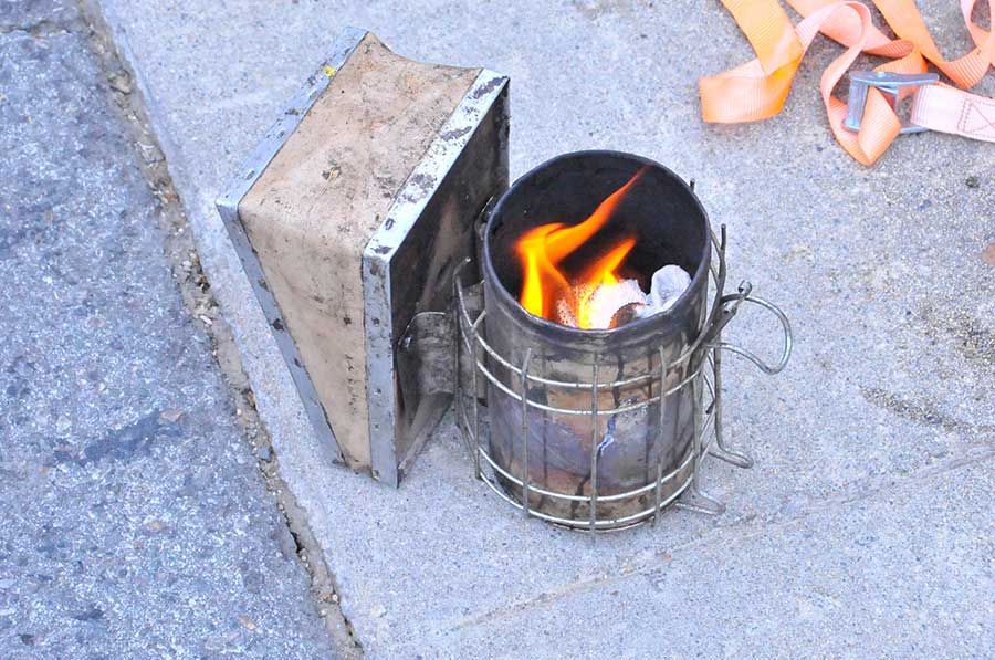 He started by firing up his smoker with old rags, leaves, and pieces of honeycomb; he believes the scent of burning honeycomb makes bees more likely to leave because they think their hive is on fire.