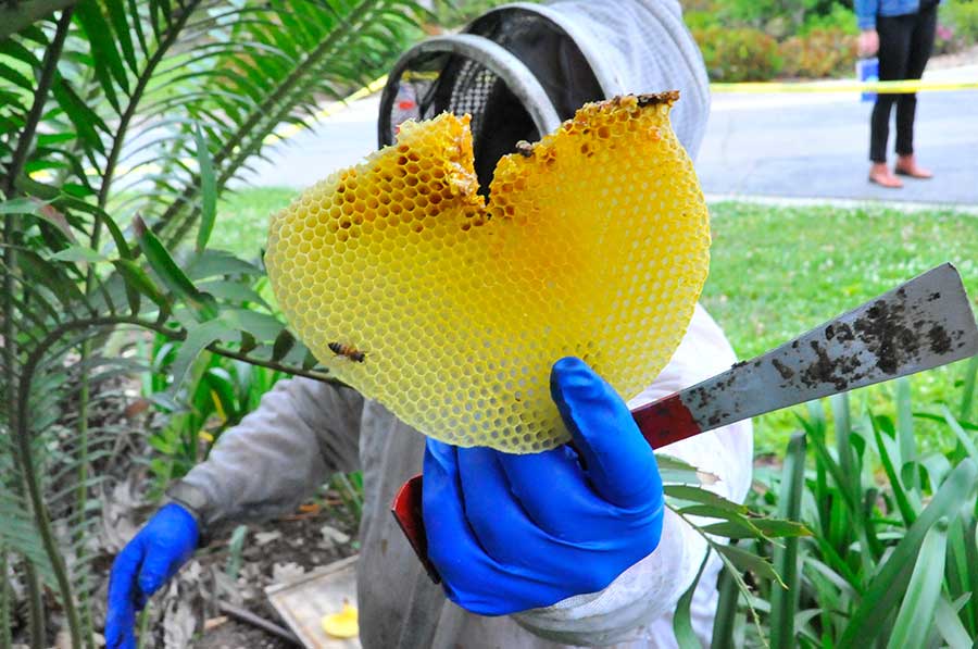 Often hives will exist for years without causing problems. That was the case in the Japanese Garden, where a massive beehive thrived within the roof of the historic Japanese House for years, Mitchell said. But the bees had to be relocated last summer after temperatures spiked to more than 115 degrees, causing the honeycombs to melt and honey to drip down the iconic structure. It was a very mature hive. “The combs were more than two feet long,” Mitchell said.