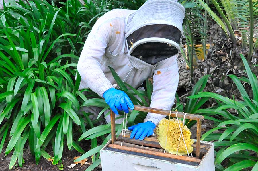 Heydman, clad in a bee suit, sat by the cycad and carefully removed large pieces of comb. “They’re waking up,” he said, as the confused bees started to leave their hive. Heydman carefully strapped the comb onto wooden frames that he then inserted, one by one, into a bee box. Wearing thick, blue rubber gloves, Heydman then gently scooped the bees out of the hole and placed them on top of the box. He needed to get the queen out so her workers would not return to the cycad and get enough bees out in general to keep the brood colony warm. “If we can get another 100 bees, it’ll be better for the colony,” Heydman said, gently scooping out handful after handful.