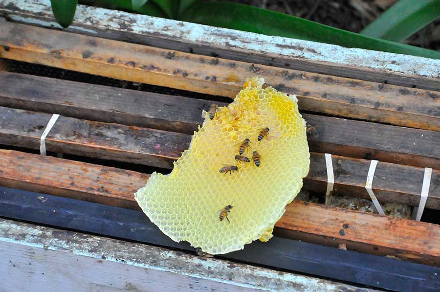 Bees and a piece of honeycomb on a bee box. Photo by Andrew Mitchell.