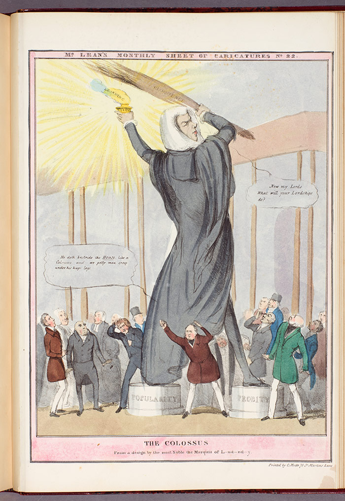 Robert Seymour, “The Colossus,” The Looking Glass, Oct. 1831. Seymour shows Lord Brougham (whose name sounded like "broom") as a colossus who is about to strike the Tories with his giant broom if they do not vote for reform. The scene is funny but also disturbing, as it implies that the new government could become tyrannical. The Huntington Library, Art Collections, and Botanical Gardens.