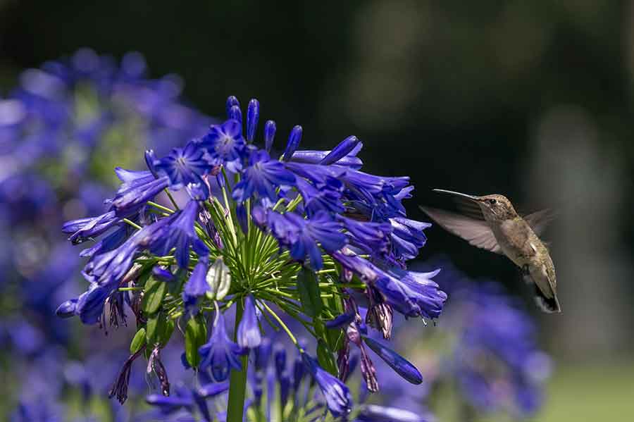 A female Anna’s hummingbird (Calypte anna) hovers next to a cluster of brilliant blue Agapanthus ‘Ellamae’ blooms near the North Vista. Photo by Martha Benedict.