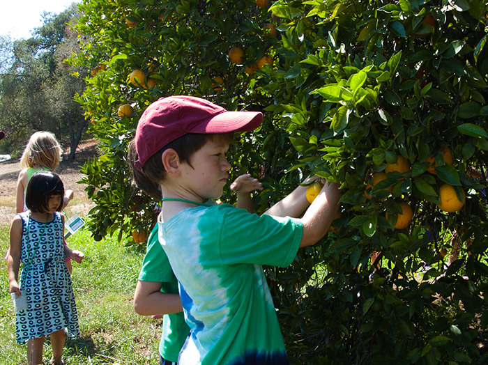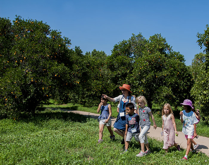Instructor Emily Earhart leads children through The Huntington’s historic Valencia orange groves to pick fruit. Photo by Deborah Miller.