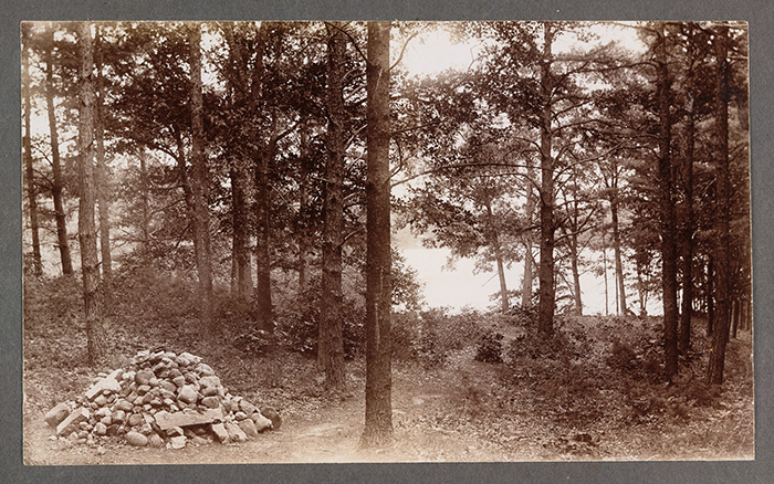Site of Thoreau’s cabin at Walden Pond, where visitors placed stones in remembrance, ca. 1895. The Huntington Library, Art Collections, and Botanical Gardens.