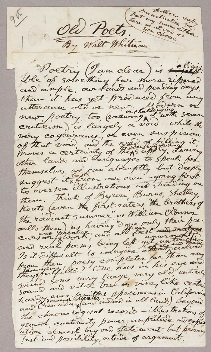 Also from the Bryce archive is one of Walt Whitman’s last published works, an essay titled “Old Poets.” It appeared in the North American Reviewin November 1890; Whitman died on March 26, 1892.