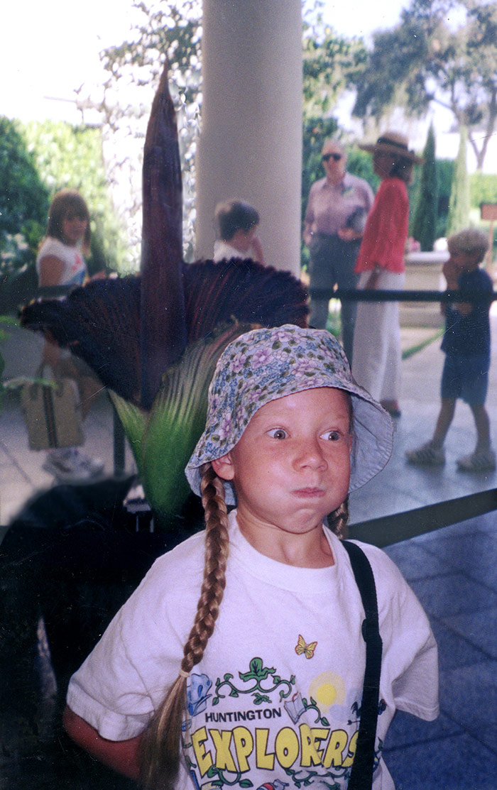 The first bloom, in 1999, caused the greatest sensation of all five events for visitors and staff alike. It was obtained in March of that year from longtime friend of the gardens, Dr. Mark Dimmitt of Tucson, Ariz. Mark in turn had obtained it from the Index Seminum of the Palmengarten in Frankfurt, Germany. This plant was given the accession number 85000, which means it’s the 85,000th plant to be recorded in The Huntington’s living collections. This reference number makes it easier to distinguish it from our other titan arums.