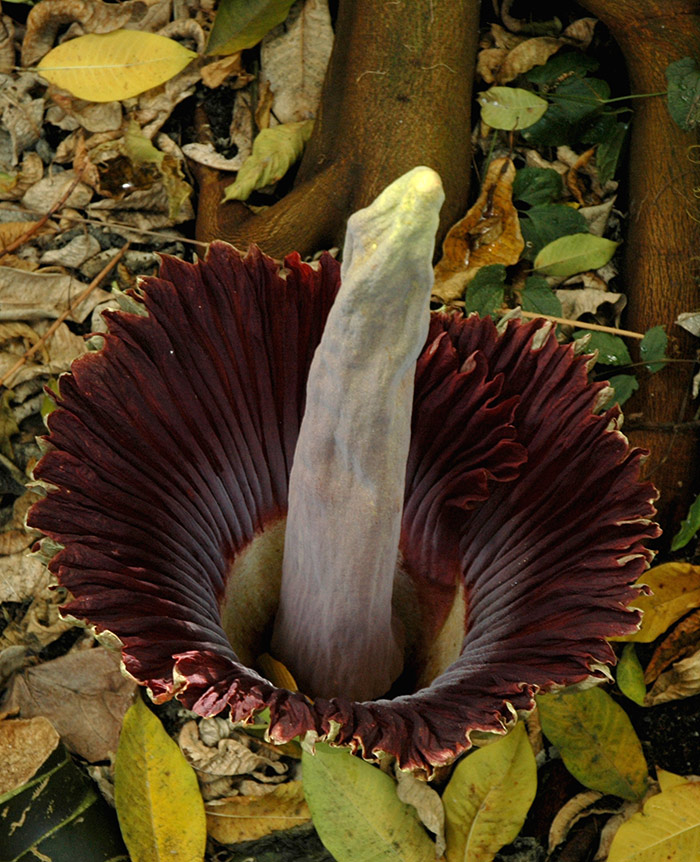 The inflorescence of the 2009 blooming was preceded by a very large leaf: the leaf stalk (petiole) was about 12 feet tall and about 10 inches in diameter. This leaf remained viable for a year and a half. The size and vigor of a leaf can be an indication of flowering capacity. Besides being the result of self-pollination, this plant was also unusual in that it was planted in an open bed in The Rose Hills Foundation Conservatory for Botanical Science here at The Huntington. This allowed the root system to develop freely and help the corm store up more energy than it might be able to in a pot. This placement also provided a scenic venue resembling its forest habitat in Sumatra. After a leafless dormancy of a few months, this plant pushed up an inflorescence nearly seven feet tall, the largest of the five blooms at The Huntington.