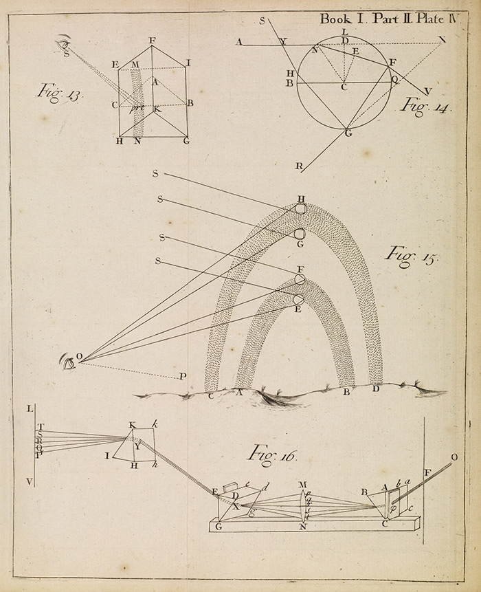 Illustration from Isaac Newton’s Opticks, 1717 (second edition). Book I, part II, plate IV. The Huntington Library, Art Collections, and Botanical Gardens.