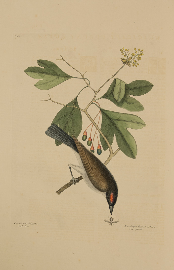The Tyrant bird on a sprig of sassafras. Natural history of Carolina, Mark Catesby. London, 1731. Volume 1, plate 55. The Huntington Library, Art Collections, and Botanical Gardens. Photo by Kate Lain.