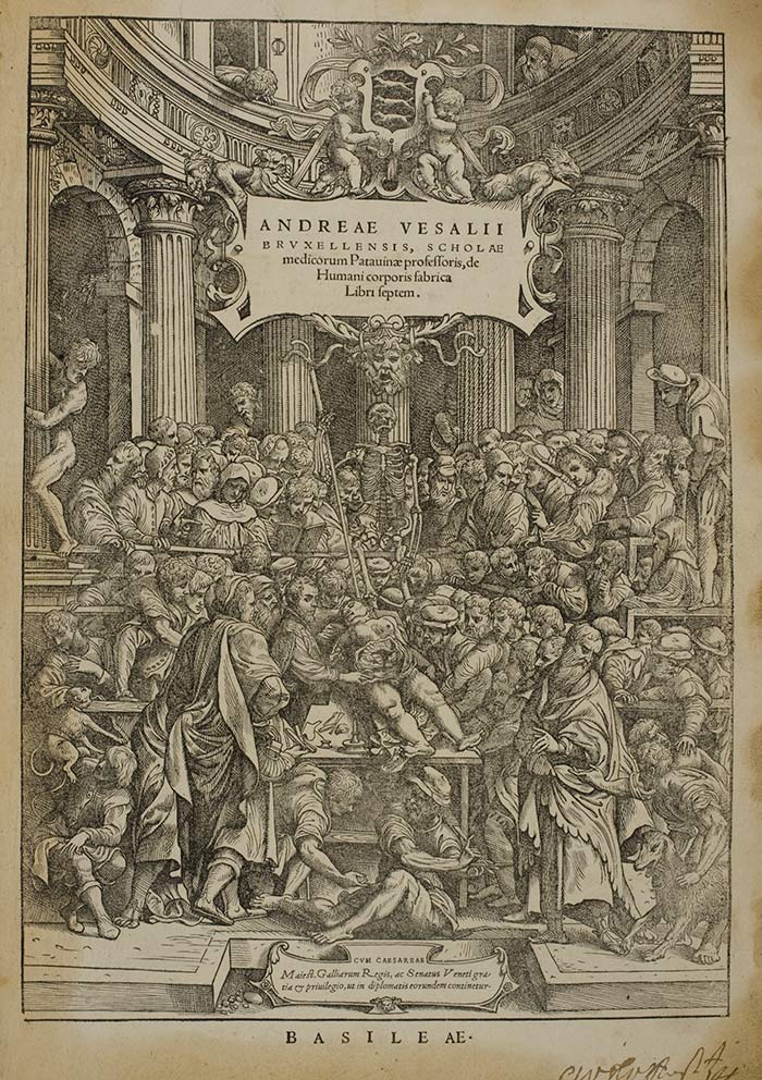 On the title page of the 1543 De humani corporis fabrica, Vesalius performs a dissection in an anatomical theater in Padua, Italy. Did John Stephen van Calcar, a pupil of Titian, make this illustration? The Huntington Library, Art Collections, and Botanical Gardens.