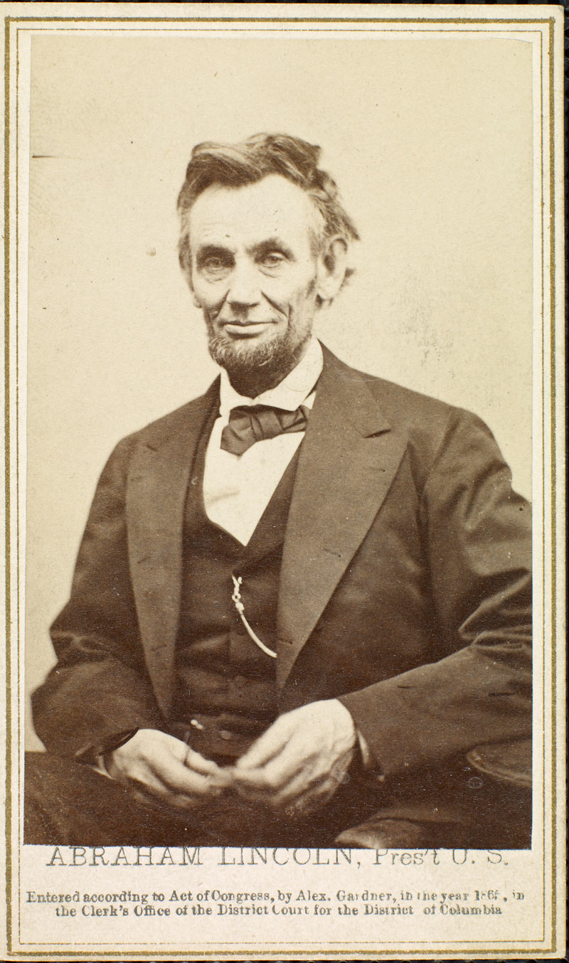 Portrait of Lincoln by Alexander Gardner (1821–1882), taken on April 10, 1865. This carte de visite photograph is on display.