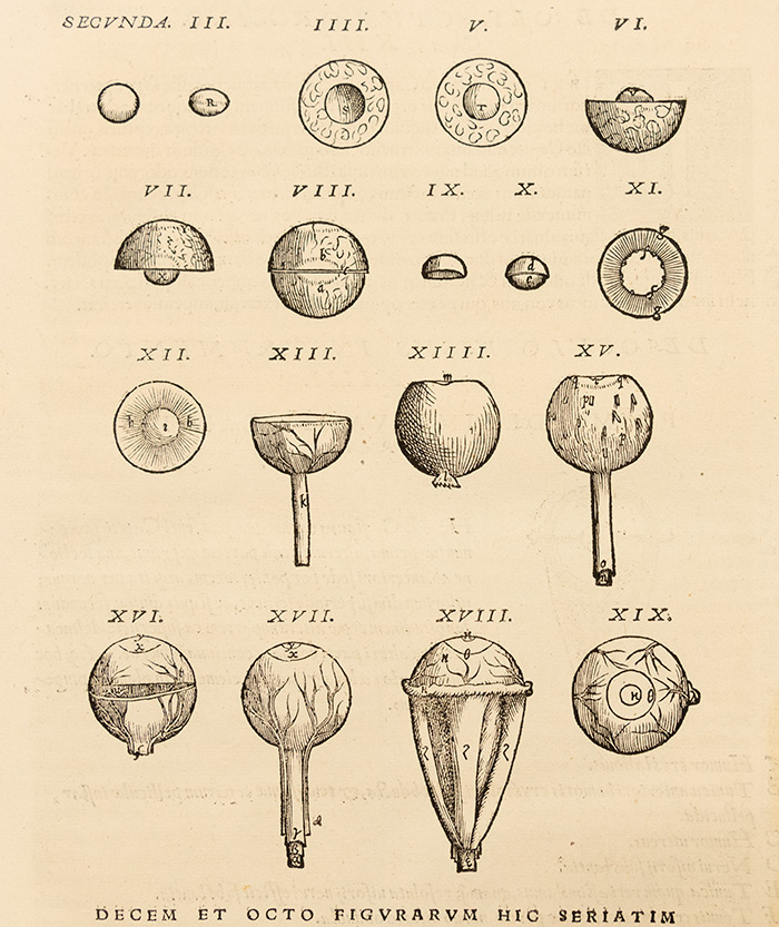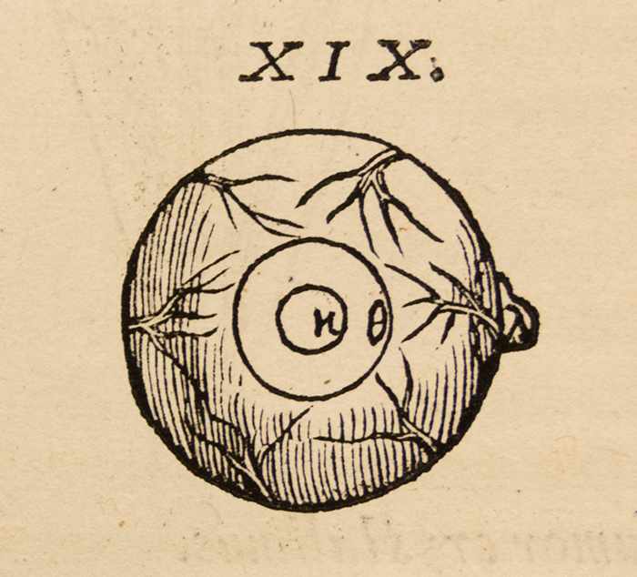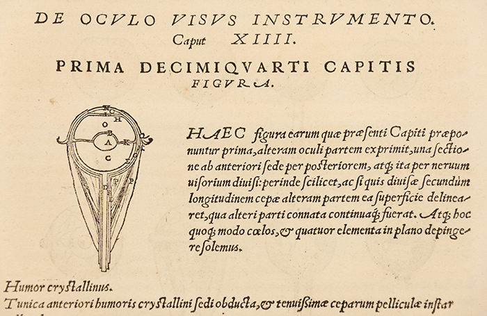Detail from Vesalius’s idealized depiction of the shapes and sizes of the parts of the eye. From Andreas Vesalius, De humani corporis fabrica (On the Fabric of the Human Body), 1543. The Huntington Library, Art Collections, and Botanical Gardens. Photo by Kate Lain.