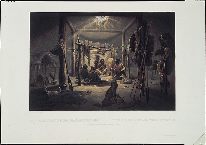 Karl Bodmer (1809–1893), “The Interior of the Hut of a Mandan Chief,” from Travels in the interior of North America, 1832–34, by Maximilian, Prinz von Wied (1782–1867). The Huntington Library, Art Collections, and Botanical Gardens.