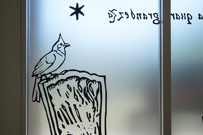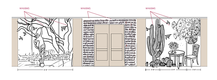 The effortless quality of the final drawings belies the challenge Reynolds faced as she struggled with scaling up images to fill each 12-foot-wide window. As an artist who specializes in science and nature drawings, Reynolds is accustomed to working on a smaller scale. To achieve the larger scale, she created an Excel spreadsheet that calculated proportions for each item; then, as if by magic, the tiny drawings started to fill up the space. “It’s the first time I’ve used a spreadsheet in an art project!” she says.