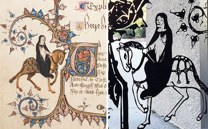 “In the original, you can see the contrast between the red, the gold, and the blue, but when it shifted to black and white, all that became just a dark blob,” explains Katura Reynolds, describing the challenge of transferring the 600-year-old illuminated manuscript to window stencils. Left: Geoffrey Chaucer (ca. 1343–1402), The Prioress’s Tale, from the Ellesmere manuscript of The Canterbury Tales, England, ca. 1400–1405. The Huntington Library, Art Collections, and Botanical Gardens. Right: detail of the prioress in the Mapel Orientation Gallery window.
